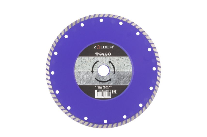 Диск алмазный турбо бренда ZOLDER применяется для разрезания твердых материалов. Дает возможность работать с бетоном, камнем, кирпичом, керамогранитом, и оптимален в работе с железобетоном. Основа диска изготовлена из стали, высокопрочное покрытие с алмазной крошкой обладает повышенной износоустойчивостью и длительным сроком службы. Отсутствие зазоров компенсируется отверстиями по всему диаметру диска, которые создают необходимое охлаждение во время работы и необходимый отвод продуктов резки.