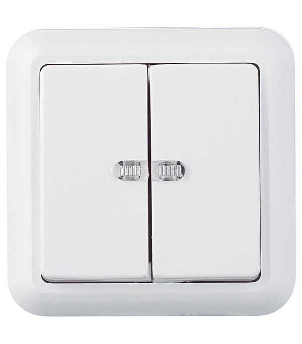 Предназначен для включения и выключения света в квартирах, офисах, загородных домах. Выключатель двухклавишный, с подсветкой, белый, открытой установки.