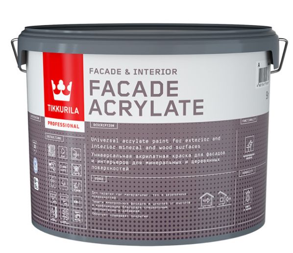 Водно-дисперсионная акрилатная краска. Для наружных работ окраска фасадов, цоколей жилых, торговых, промышленных, складских и др. помещений по бетону, штукатурке, минеральным и акриловым декоративным материалам, фиброцементным плитам, вертикальным деревянным поверхностям из вагонки, строганным и пиленым дощатым фасадам, а также по балкам и откосам, подверженным атмосферным нагрузкам. Для внутренних работ: окраска стен и потолков внутри жилых, торговых, промышленных, складских и др. помещений, в том числе с повышенной влажностью, по бетонным, кирпичным, оштукатуренным, зашпатлеванным поверхностям, гипсокартону, ДСП и ДВП плитам. Также используется для отделки ранее окрашенных водно-дисперсионными красками прочно держащихся поверхностей (после предварительного зашкуривания). Краска не рекомендуется для отделки поверхностей, ранее окрашенных известковыми, силикатными красками и органическими эластичными покрытиями.