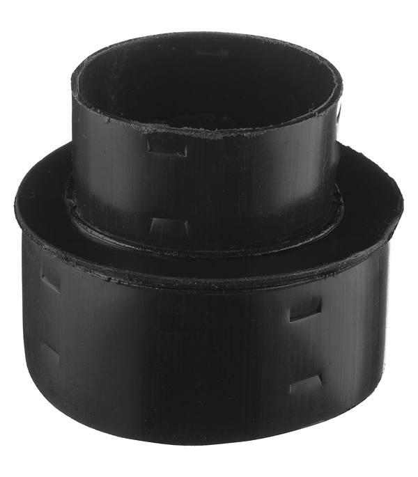 Переходник представляет собой пластиковый элемент в виде цилиндра с разными диаметрами на концах и со специальными фиксирующими выступами с внутренней стороны, обеспечивающими надежное соединение. Предназначен для соединения по длине труб разного диаметра.