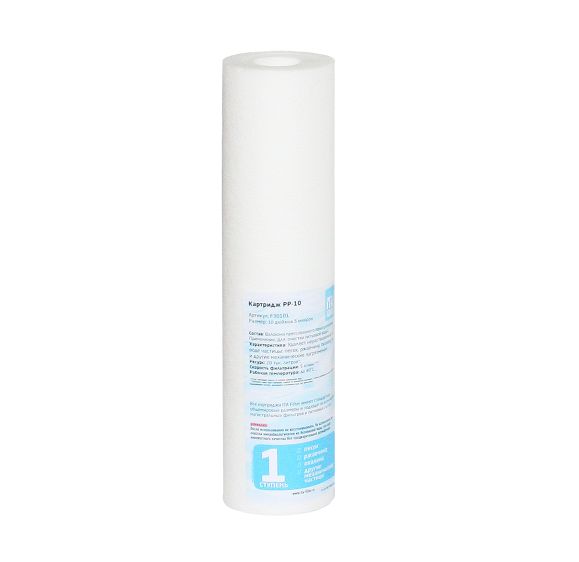 Картридж механической очистки воды из волокон прессованного полипропилена. Подходит ко всем фильтрующим системам со стандартом корпуса 10 дюймов.