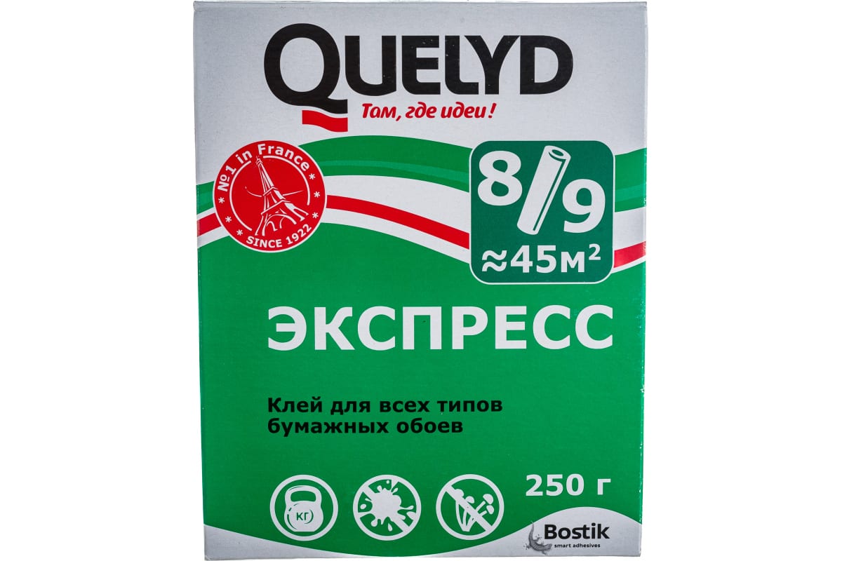 Клей Quelyd "Супер Экспресс" идеально подходит для всех типов бумажных обоев (легких, тяжелых, плотных, моющихся), а также для легких виниловых обоев.