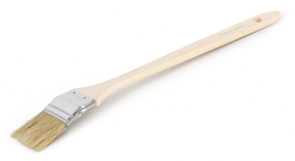 Кисть радиаторная применяется для покраски в труднодоступных местах любым лакокрасочным составом на больших и малых поверхностях. Она имеет длинную, изогнутую ручку, именно благодаря этому ею удобнее наносить краску между профилями, секциями радиаторов отопления, за трубами, в углах и на других участках, где неудобно работать стандартным малярным инструментом