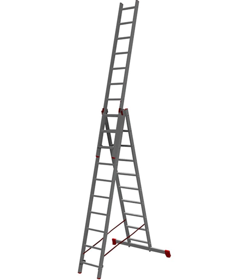 Трехсекционная универсальная алюминиевая лестница это многофункциональное приспособление для разных работ. Может использоваться в приставном варианте, как двухсекционная лестница, а так же в качестве стремянки и в виде раздвижной, телескопической конструкции. Комплектуется страховочными ремешками, что повышает безопасность работ. Двухкомпонентные наконечники, которыми оснащены опоры, защищают лестницу от скольжения во время работы.