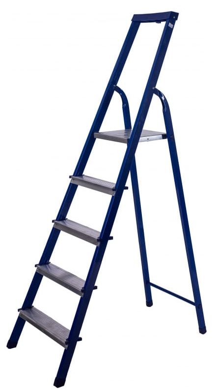 Стальная стремянка выполнена из прямоугольного профиля и окрашена синей полимерной краской. Эта модель рассчитана на высокую нагрузку, обеспечивает хорошую устойчивость как всей конструкции, так и каждой ступеньки по отдельности. Ступени выполнены из алюминия, имеют специальное рифление, что снижает вероятность скольжения во время работы. Прочный страховочный ремень предотвращает выход стремянки из рабочего положения, что обеспечивает безопасную работу на верхних ступенях. Применяется в быту и строительной области.