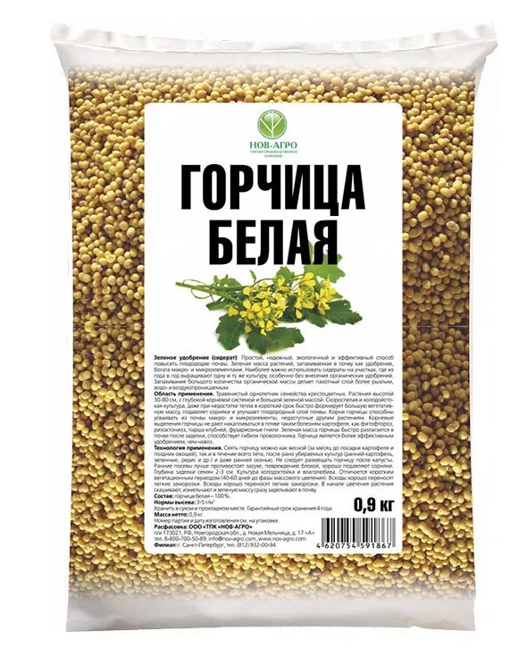 Горчица – прекрасный сидерат, применяется для дезинфекции почвы от болезней, обогащения органикой и борьбы с вредителями. Зеленая масса горчицы, измельченная и заделанная в почву, в два раза эффективней навоза. Обладает фунгицидными и бактерицидными свойствами. Очищает почву от проволочника, нематод - вредителей картофеля, свеклы и моркови.